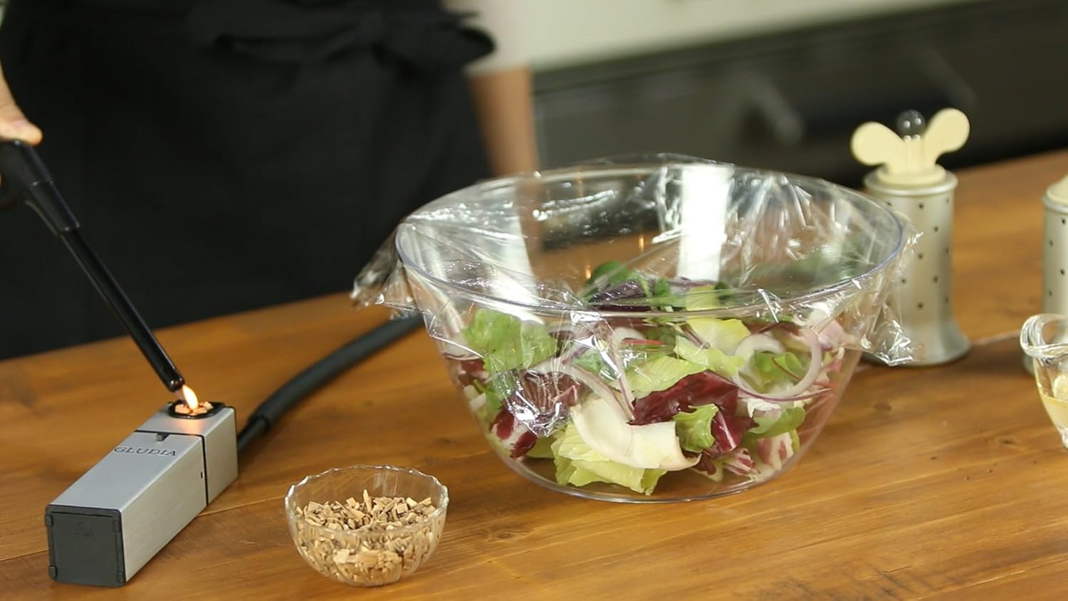 このGLUDIAの燻製器は、本体にスモークチップをセットすればチューブの先から煙が噴き出すんです。
